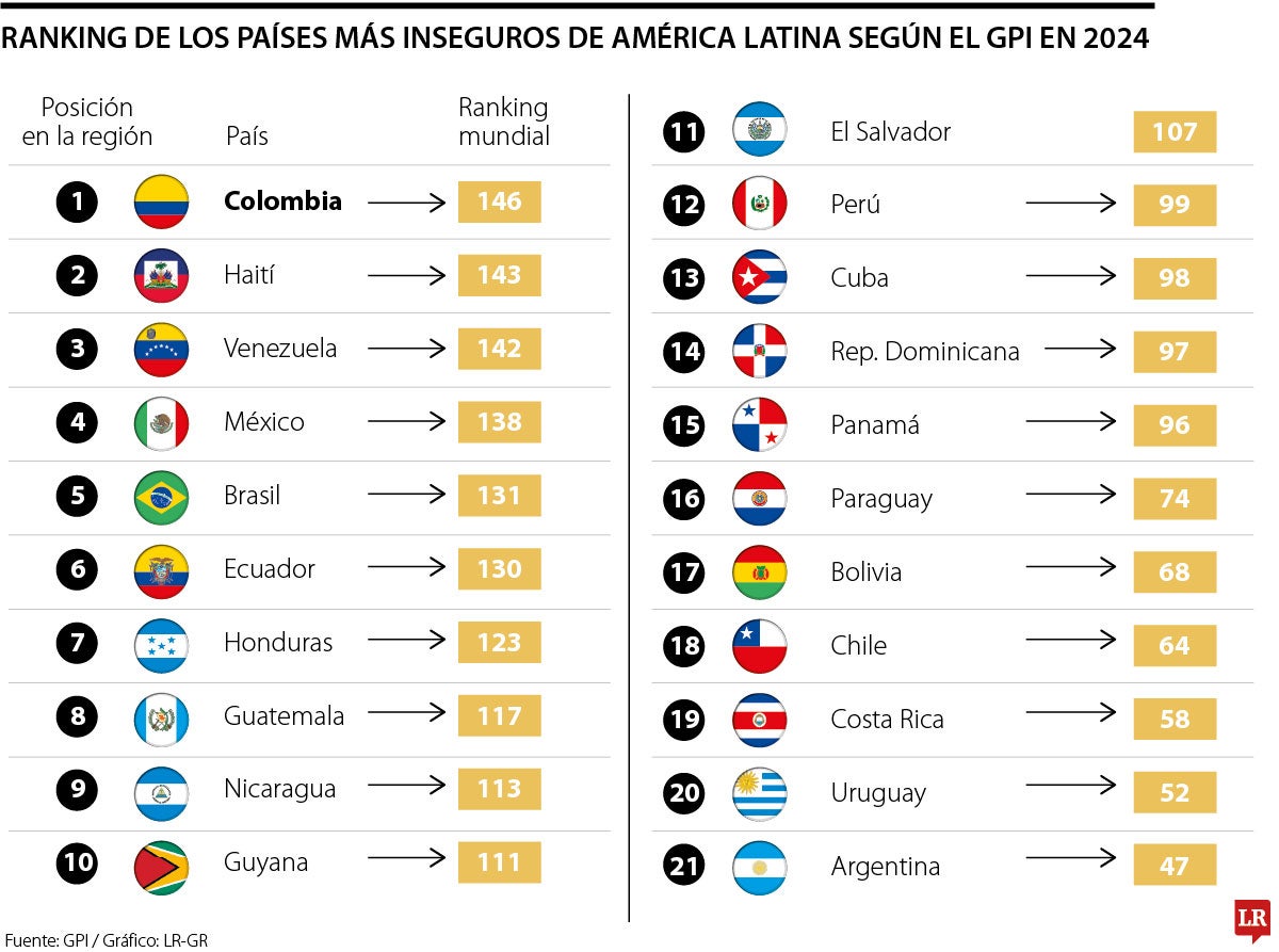 Colombia lidera por cuarto año consecutivo la lista como el país más inseguro, seguido de Haití y Venezuela, ubicándose en los puestos 142, 143 y 146 globalmente, reflejando graves problemas de violencia y conflictos internos.