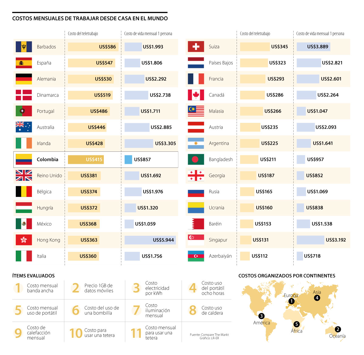 En el más reciente estudio realizado por la firma australiana Compare The Market sobre los países más costosos para trabajar desde la casa en el mundo, Colombia y México se ubican entre los primeros lugares, ocupando el puesto número ocho, con un costo mensual de US$$414, y el lugar número 12, con un valor en gastos de US$368, respectivamente.