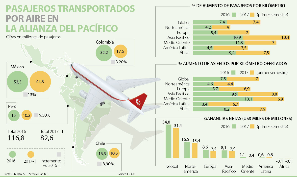 En lo corrido de 2017, los países de la Alianza del Pacífico han movido a más de 82,6 millones de pasajeros, por demanda local e internacional, a través del transporte aéreo. De ese total, Colombia movilizó 21% que corresponde a 17,6 millones de personas.