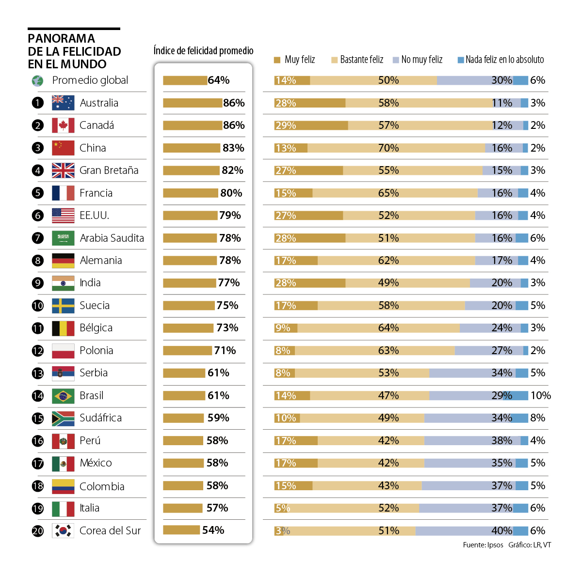 Son varios los informes que miden la felicidad en el mundo y en algunos de ellos Colombia figura en los primeros puestos, aunque en otros no le va muy bien. Esta semana se publicó un nuevo estudio realizado por Ipsos que evaluó la felicidad en 28 naciones, un listado en el que el país quedó en la posición número 18. Uno de los resultados que más llama la atención es que hubo una disminución a largo plazo en el porcentaje de adultos que se consideran felices.