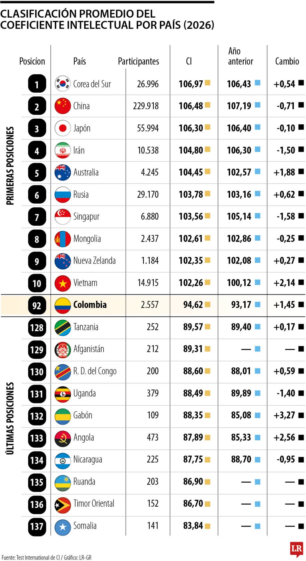 El Test Internacional de CI de 2026 muestra cambios moderados respecto al año anterior, con avances puntuales en algunos países y retrocesos en otros, en un escenario donde Asia mantiene una presencia dominante en los primeros lugares y América Latina se ubica en la mitad de la tabla, sin grandes saltos estructurales.