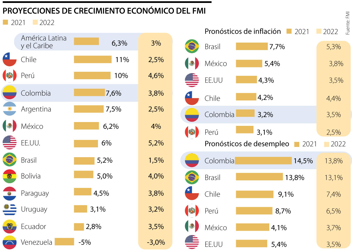 De cumplirse estas previsiones publicadas ayer por el FMI en su último informe de perspectivas económicas mundiales (WEO, por sus siglas en inglés), Colombia sería el tercer país con mayor crecimiento económico en Latinoamérica este año, solo por detrás de Chile y Perú, que tendrán una subida de doble dígito, de 11% y 10% respectivamente. Para el próximo año, el crecimiento de Colombia quedaría solo por debajo de Perú y de Bolivia en Latinoamérica.