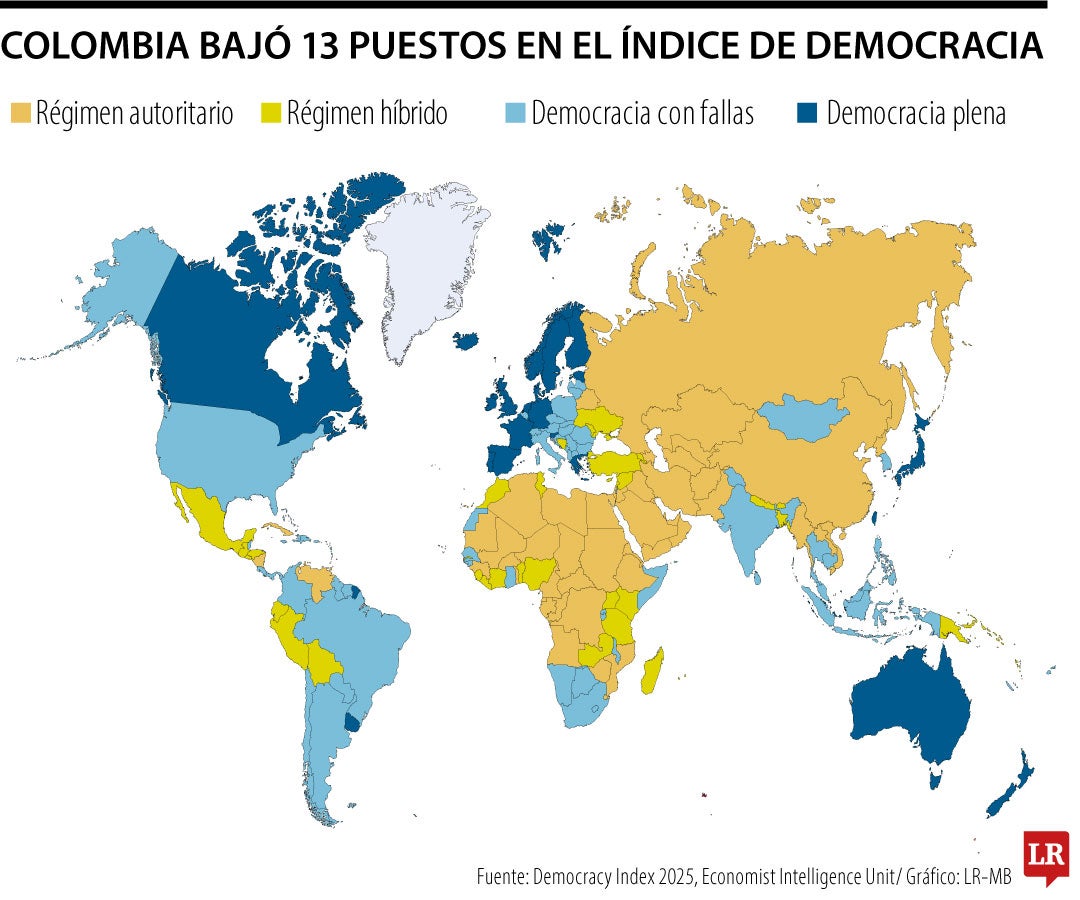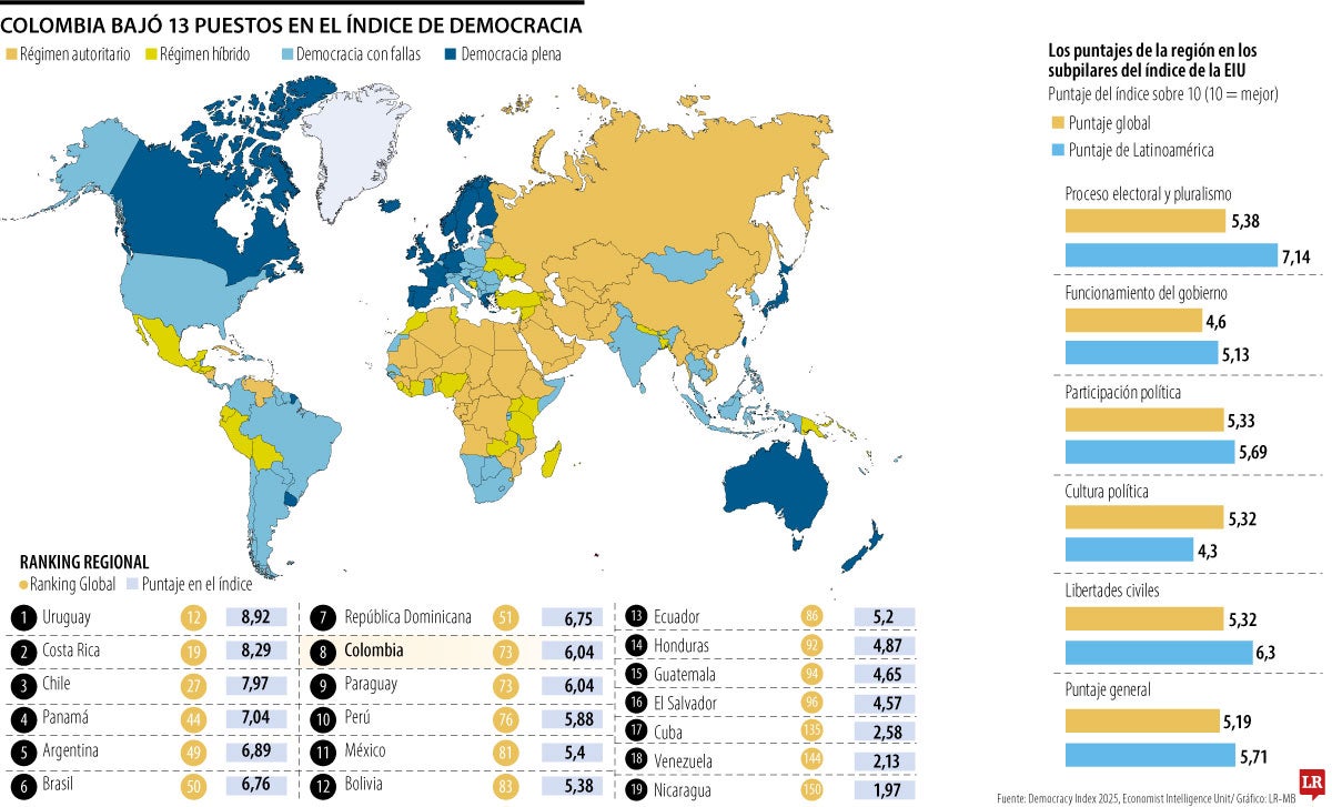 Colombia ocupó el puesto 73 a nivel global en el índice de democracia de la Economist Intelligence Unit, unidad de negocios de The Economist, el año pasado, mientras que para la región se ubicó en el octavo lugar entre 19 países. El país bajó 13 puestos dentro del ranking entre 2024 y 2025: el informe de la EIU señala que lleva dos años consecutivos teniendo amplios retrocesos dentro de la clasificación global.