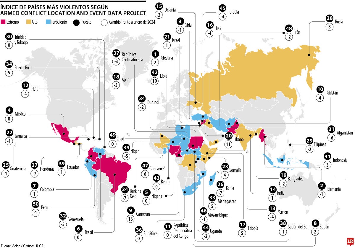 El estudio de Acled analizó a 50 países que registran conflictos internos o externos y los clasificó según su desempeño en las categorías de letalidad, difusión del conflicto, peligro para los civiles y fragmentación de los grupos en disputa.