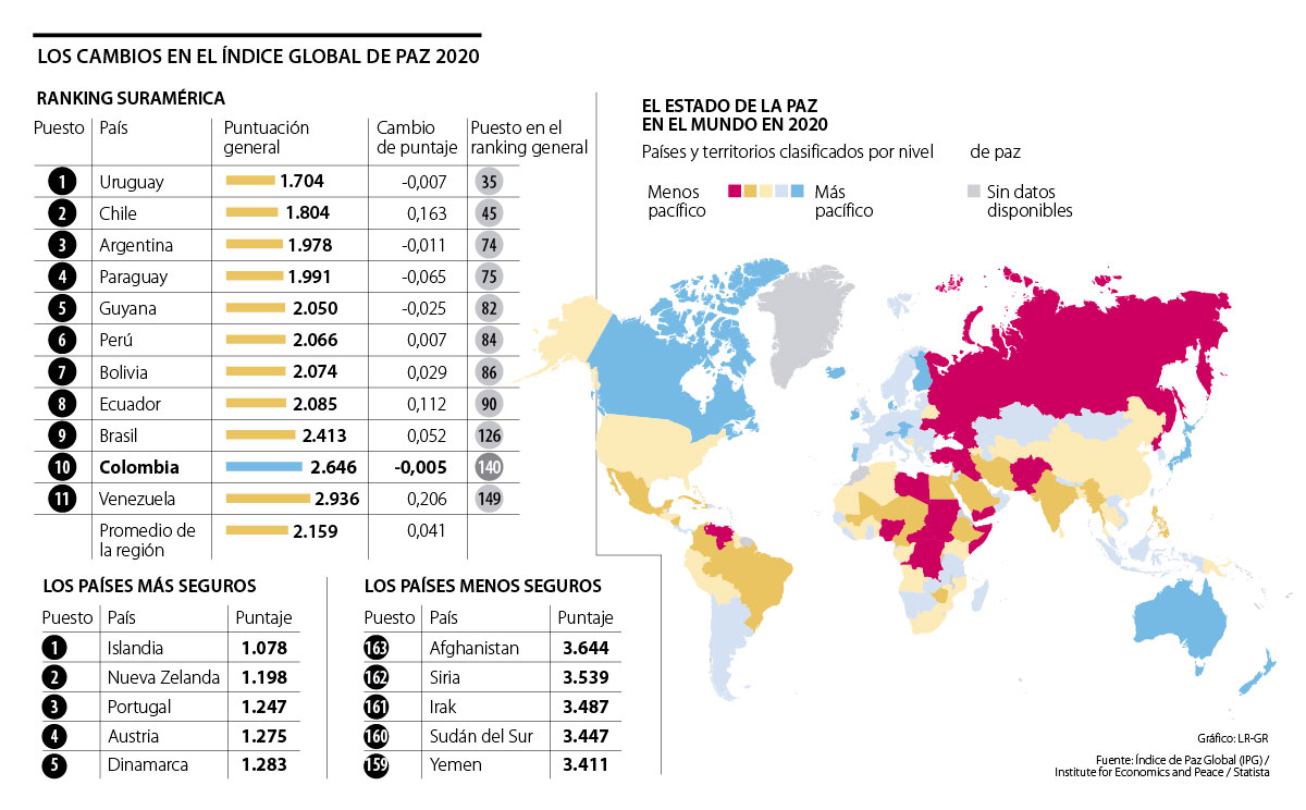 “Cuando terminó el gobierno de Santos, en 2018, ocupamos el puesto 145, es decir que habíamos mejorado cinco puestos frente al resultado de 2014 y el año pasado estuvimos en el puesto 143 y en este última entrega estamos en el 140. Si uno analiza esto, dentro del contexto internacional, nuestra posición y la forma en que nos visualizan está muy cerquita de Venezuela (149), pero nos comparamos en términos de paz con países como el Congo, Sudán, Irak, Afganistán y Rusia”, añadió Granada.