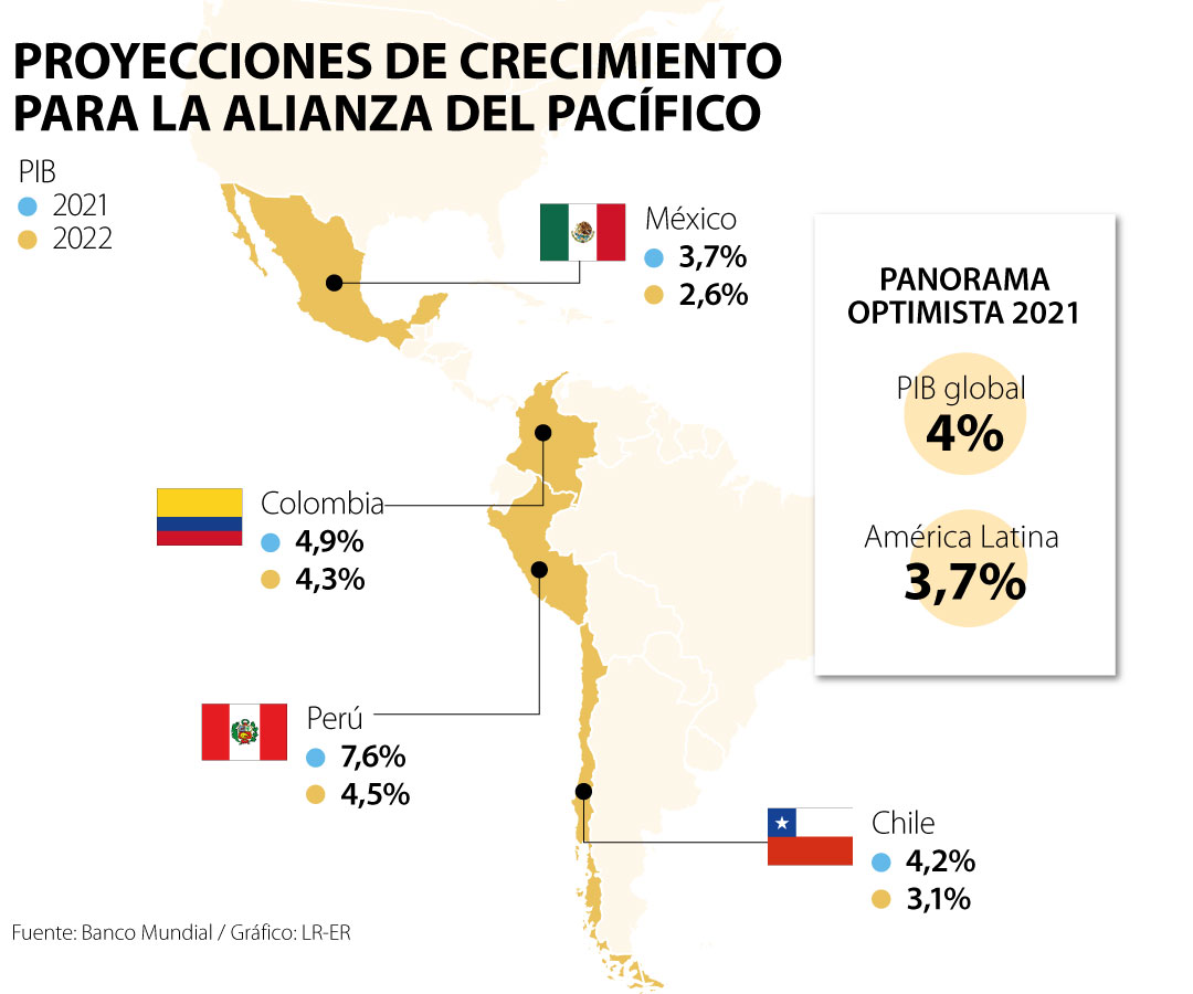 Para la entidad el manejo de la pandemia y de la inversión serán dos elementos clave en las cifras económicas de este año. En la Alianza del Pacífico Perú y Colombia liderarían el crecimiento económico para 2021 con 7,6% y 4,9% respectivamente. Sin embargo, como lo han explicado diferentes entidades internacionales estas cifras representan, principalmente, un rebote luego de la caída de 2020.