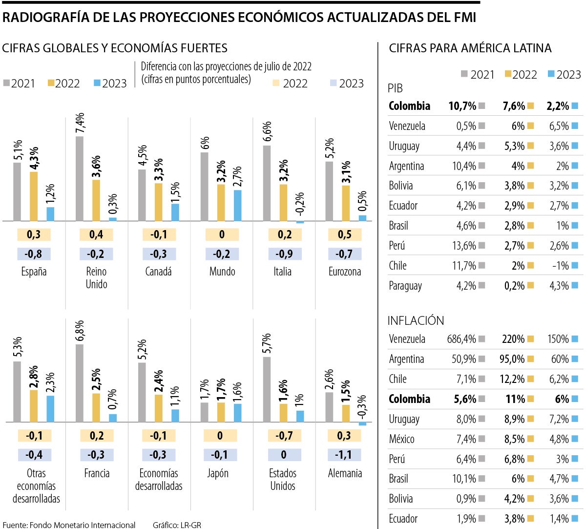 Colombia es la economía de América Latina que más crecerá este año, según cifras del Fondo Monetario Internacional (FMI). Las proyecciones de este organismo apuntan a que el PIB repuntará 7,6%, lo que representa un aumento en las proyecciones frente a lo revelado a mitad de año, cuando se decía que podría cerrar 2022 con un repunte de 6,3%.