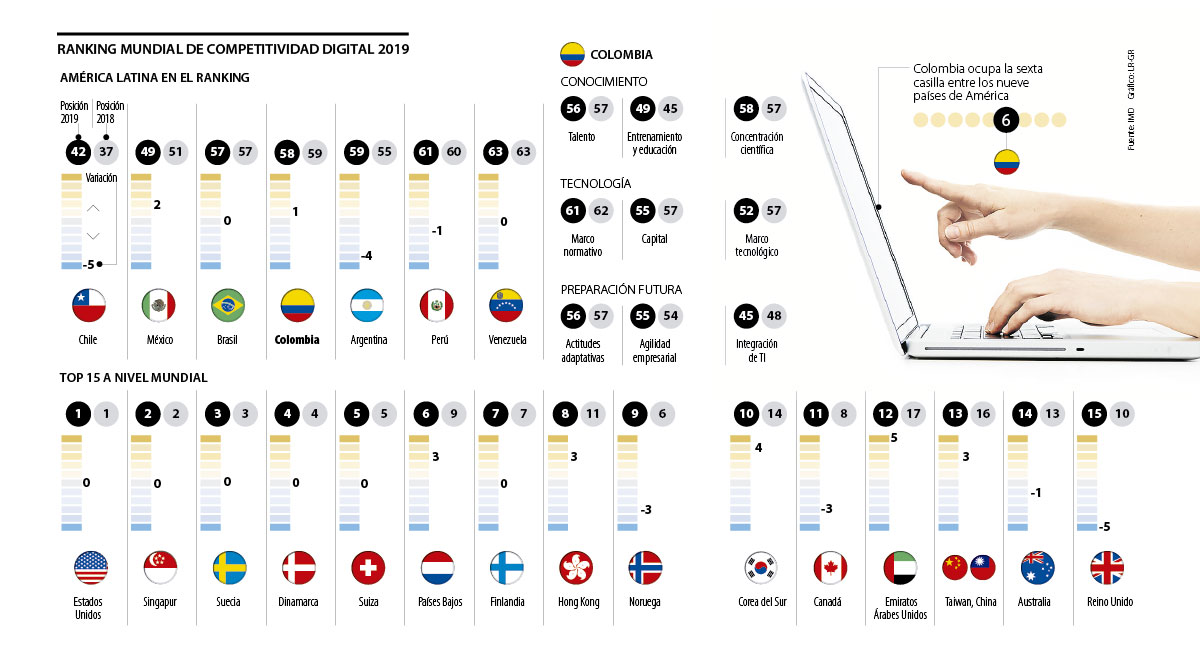 La edición 2019 del Ranking de Competitividad Digital Mundial del IMD (Instituto Internacional para el Desarrollo de la Gestión) no cambió en el top cinco, pues Estados Unidos, Singapur, Suecia, Dinamarca y Suiza siguen siendo los líderes de este estudio que evalúa en total a 63 economías.