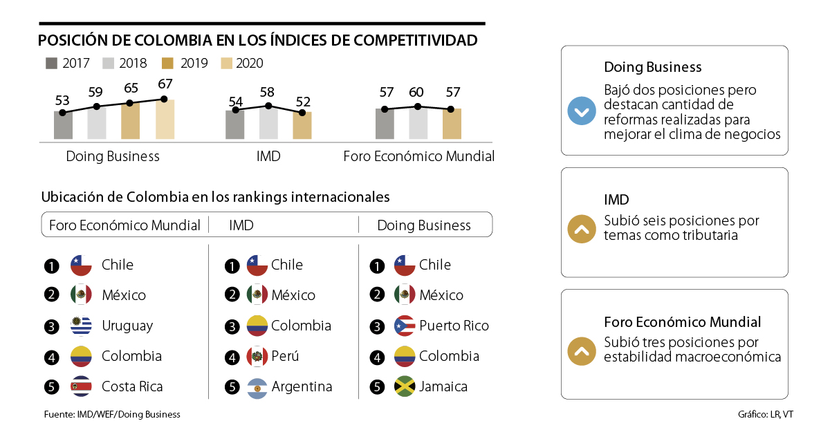 De los tres principales informes internacionales que se publican al año en materia de competitividad y mejora de negocios, Colombia ascendió en dos de ellos: en el del Foro Económico Mundial y en el del IMD, mientras que bajó en el más reciente del Doing Business que elabora el Banco Mundial.