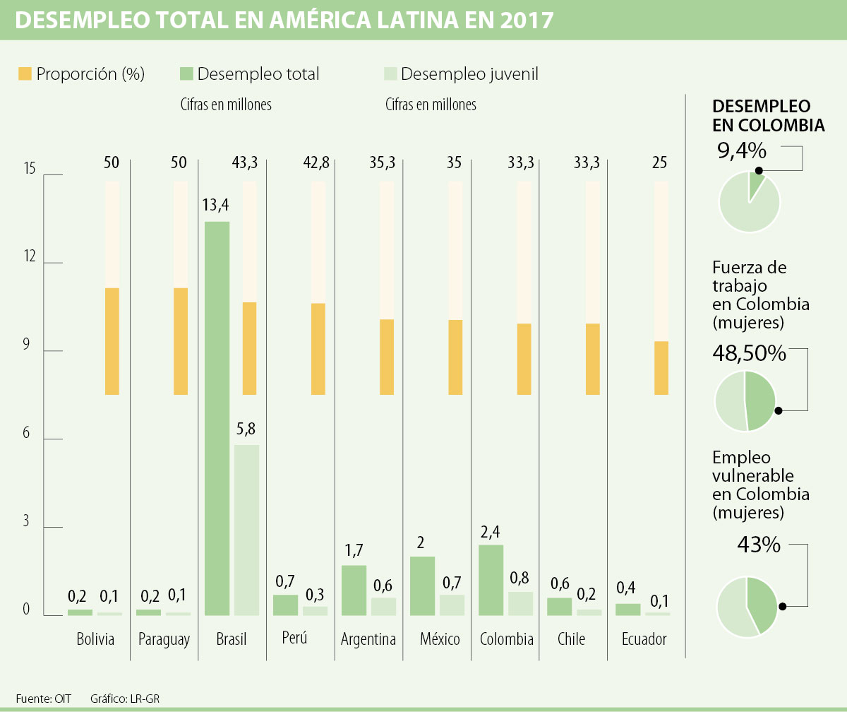 Si se analiza el dato absoluto de desempleo juvenil, Brasil tiene la mayor tasa de América Latina en 2017 con 5,8 millones y proyecciones de 5,3 millones para 2018, siendo también el país que mayor reducción tendrá. Por su parte, Bolivia, Paraguay y Ecuador manejaron una tasa de 100.000 desempleados entre 15 y 24 años el año pasado. En el caso colombiano se obtuvo una tasa de 800.000 jóvenes, que continuaría en 2018, lo que lo posiciona como el segundo país con la mayor cifra de la región, solo superada por Brasil, una estadística en la que hay que tener en cuenta que son los dos con la mayor población en Sudamérica.