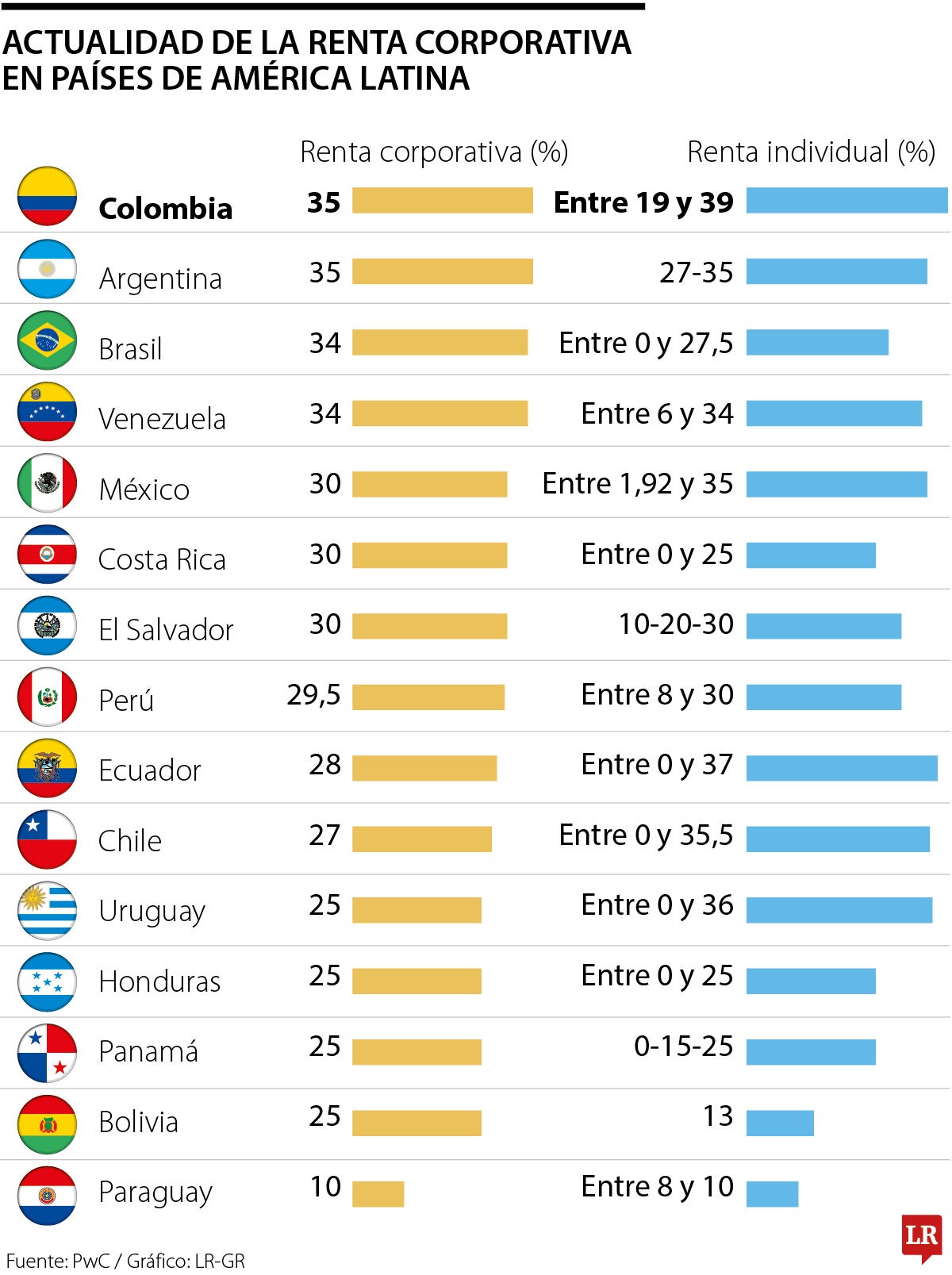 De acuerdo con datos entregados por PwC, Colombia se posiciona como el país con la tasa corporativa más alta de la región con 35%;seguida de ella está Argentina también con 35% y Brasil y Venezuela cierran el top 3% con 34% de esta tasa.