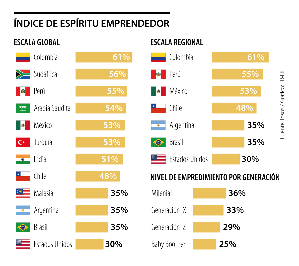Luego de estandarizar los resultados de las mediciones, Colombia coronó la lista con un registro de 61% en el marco global de países donde hay mayor inclinación hacia el emprendimiento joven.