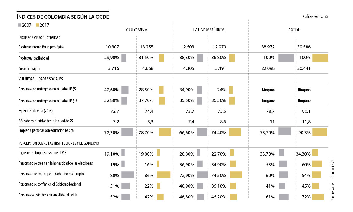 De acuerdo con el último informe de la Organización para la Cooperación y el Desarrollo Económicos (Ocde) respecto al avance de América Latina en términos monetarios y sociales, Colombia ha avanzado en diferentes indicadores económicos al reducir el índice de personas que viven con menos de US$5 desde 42,6% en 2008 a 28,5% en 2016. Si bien esto demuestra una tendencia contraria al resto de la región, donde la cifra promedio llegó a 37,7%, los analistas aseguran que la inequidad laboral y la desconfianza en las instituciones aún amenazan el desarrollo de la nación.