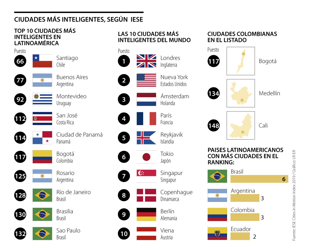 Bogotá, Medellín y Cali son la cuota colombiana en el ranking mundial de ciudades inteligentes que elabora el departamento de Globalización y Estrategia de Iese Business School a partir de 96 indicadores, distribuidos en nueve áreas principales, entre los cuales destaca: capital humano, cohesión social, economía, gestión pública, gobernanza, medio ambiente, movilidad y transporte, planificación urbana, divulgación internacional y tecnología.
