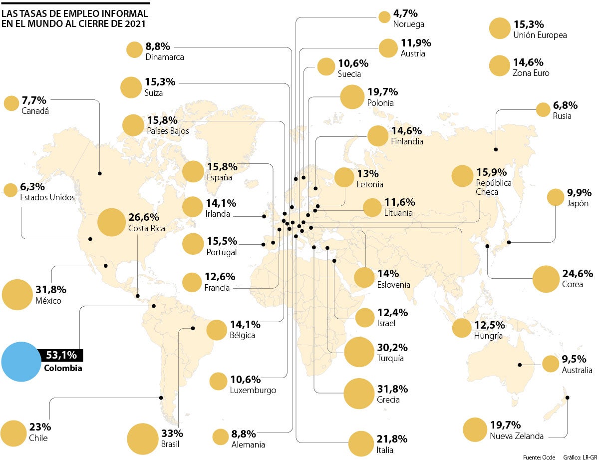 Datos recopilados por la misma organización, evidencian que Colombia sigue liderando dicho listado con una tasa de 53,1% con cifras al cierre de 2021, lo que evidencia un aumento de 180 puntos básicos, frente a un año antes, cuando registró una tasa de 51,3%. A este país le sigue Brasil con una amplia diferencia debido a que su tasa llega a 33% (igual que hace un año), perseguido por México y Grecia, con 31,8% (reduciendo los números de 2020); Turquía, con 30,2%; Costa Rica, con 26,6%; Corea, con 24,6%; y Chile, con 23%.