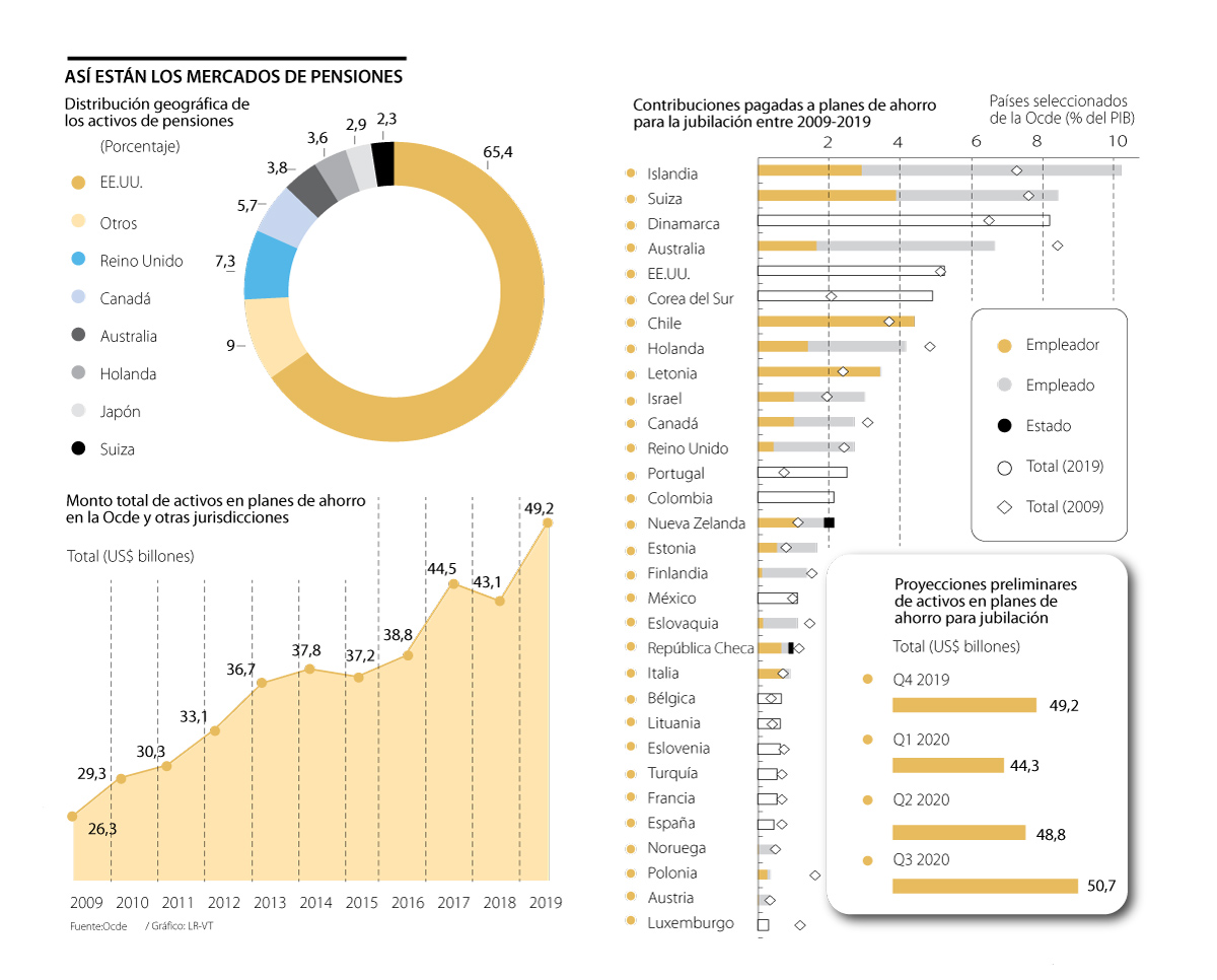 No obstante, con la inestabilidad en los mercados financieros derivada del covid-19, también se han generado pérdidas de inversión para los planes de ahorro pensional en el primer trimestre de 2020. Los pronósticos sugieren que los activos disminuyeron en 10% en el primer trimestre de 2020 en el área de la Ocde, pasando de US$49,2 billones a fines de diciembre de 2019 a US$44,3 billones para de marzo de 2020.