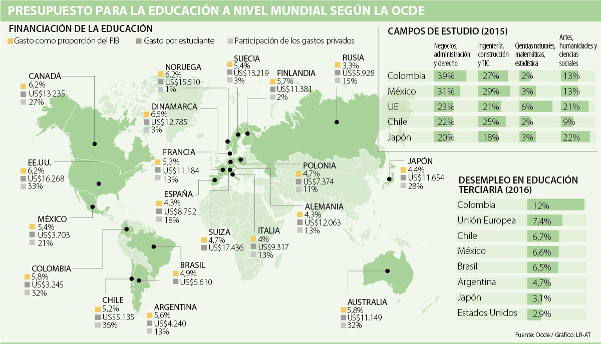 Colombia, que está en proceso de entrar a la Ocde, invierte US$3.245 por estudiante, la cifra más baja en toda América Latina, seguida por México que destina US$3.703.