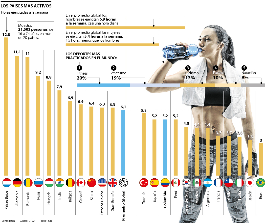 La muestra, que contó con más de 21.000 participantes, reveló que Países Bajos es el país más activo del mundo por horas ejercitadas a la semana, con 12,8. A este le siguen Alemania, con 11,1; Rumania, con 11; Rusia, con 9,2; y Hungría, con 8,8.