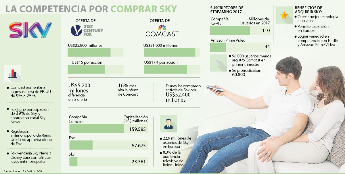 La competencia de los grandes medios de entretenimiento dio un nuevo giro ayer al formalizarse la oferta de Comcast por US$31.000 millones para adquirir a la inglesa Sky, la cadena de televisión más grande del Reino Unido que cuenta con 22,9 millones de usuarios en Europa según sus estados financieros y tiene 8,3% de la audiencia televisiva de Reino Unido, según el último reporte anual de la firma Broadcasters Audience Research Board.