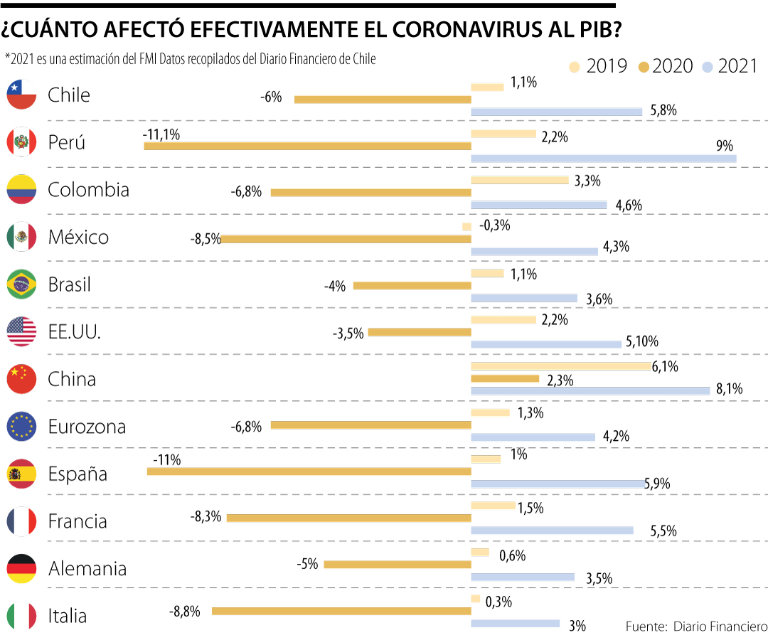Si bien la economía chilena se vio fuertemente afectada, sufrió uno de los golpes menos profundos de la región. De hecho, evitó el mayor deterioro en la Alianza del Pacífico -Chile, Colombia, México y Perú- y fuera de ella, solo Brasil tuvo un mejor desempeño, con un PIB se contrajo 4% según el Banco Central del país.