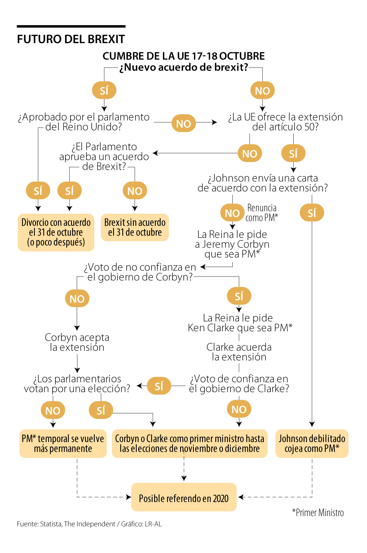 John Rentoul, también profesor visitante en King’s College de Londres, elaboró un mapa que muestra un sinfín de escenarios posibles, y en la mayoría, Johnson no queda muy bien librado. Ese diagrama inicia con la pregunta de si el 17 de octubre la Unión Europea (UE) aprueba o rechaza un nuevo acuerdo para la ejecución del divorcio de Reino Unido.