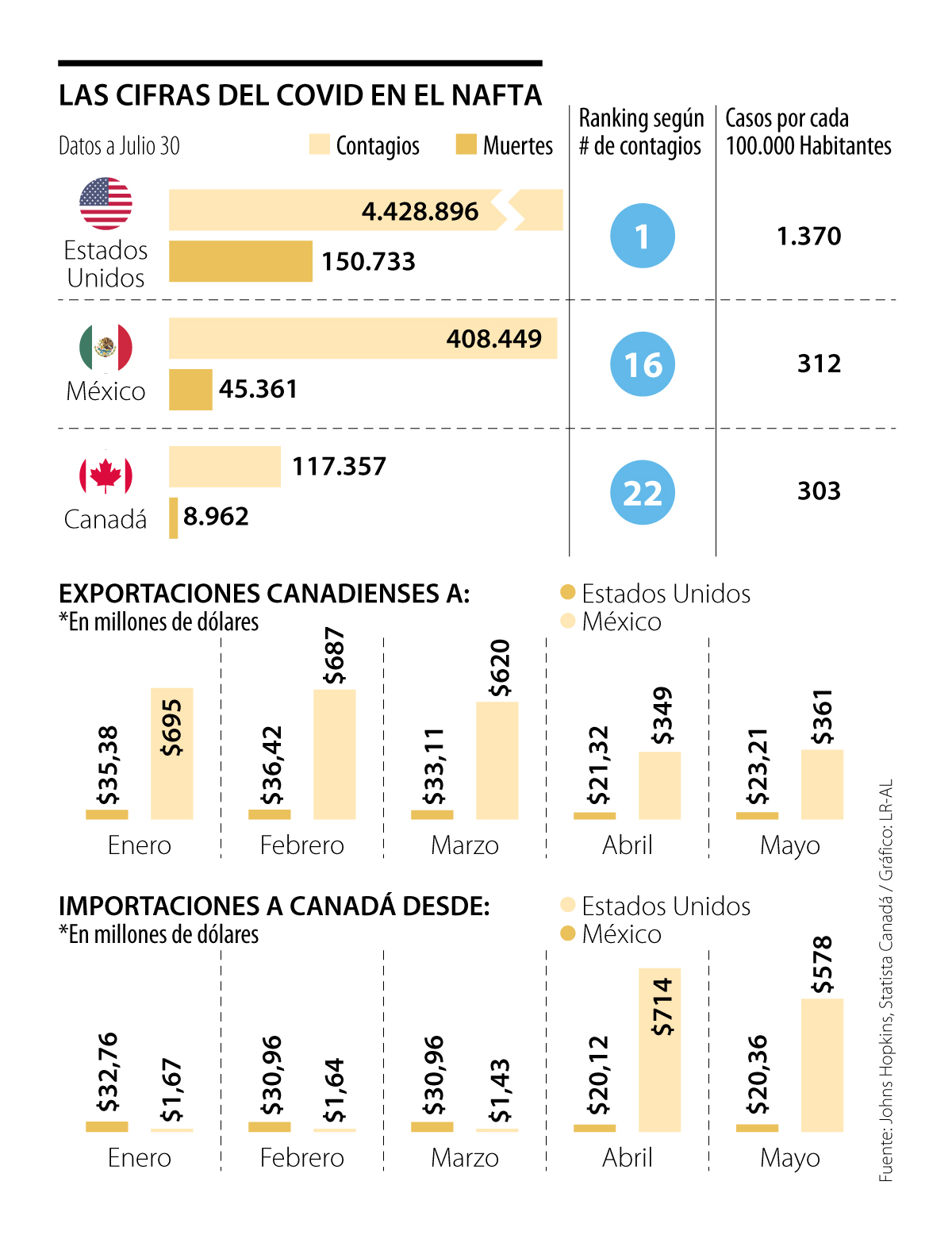 Si bien el paso fronterizo ha permanecido abierto para el tránsito de mercancías, el comercio entre los países Nafta ha venido cayendo de una forma considerable. Mientras las exportaciones canadienses a Estados Unidos sumaron US$35.383 millones en enero de este año, en mayo estas llegaron tan solo a US$23.206 millones. Lo mismo ocurrió con las ventas de Canadá a México, que pasaron de US$695 millones a US$361 millones en ese mismo periodo.