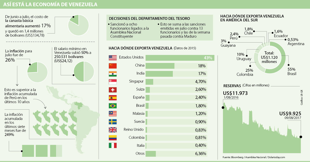 Además, el Departamento del Tesoro de Estados Unidos anunció sanciones contra ocho funcionarios ligados a la administración de Maduro y por su participación activa en la instalación de la Constituyente. En concreto, son siete funcionarios actuales y uno más antiguo, a quienes se les congelaron todos los activos que tenían en Estados Unidos y se les prohibió a los estadounidenses hacer cualquier tipo de acuerdo comercial con ellos.