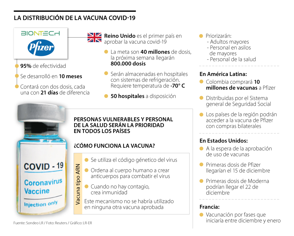 “Se abre un nuevo debate de quiénes deben ser los segundos en recibir la vacuna. Independientemente de ello, es positivo que la vacuna pueda estar disponible antes de finalizar el año y que su manufactura se pueda hacer de manera rápida”, comentó Rafael Piñeros, docente de la Universidad Externado.