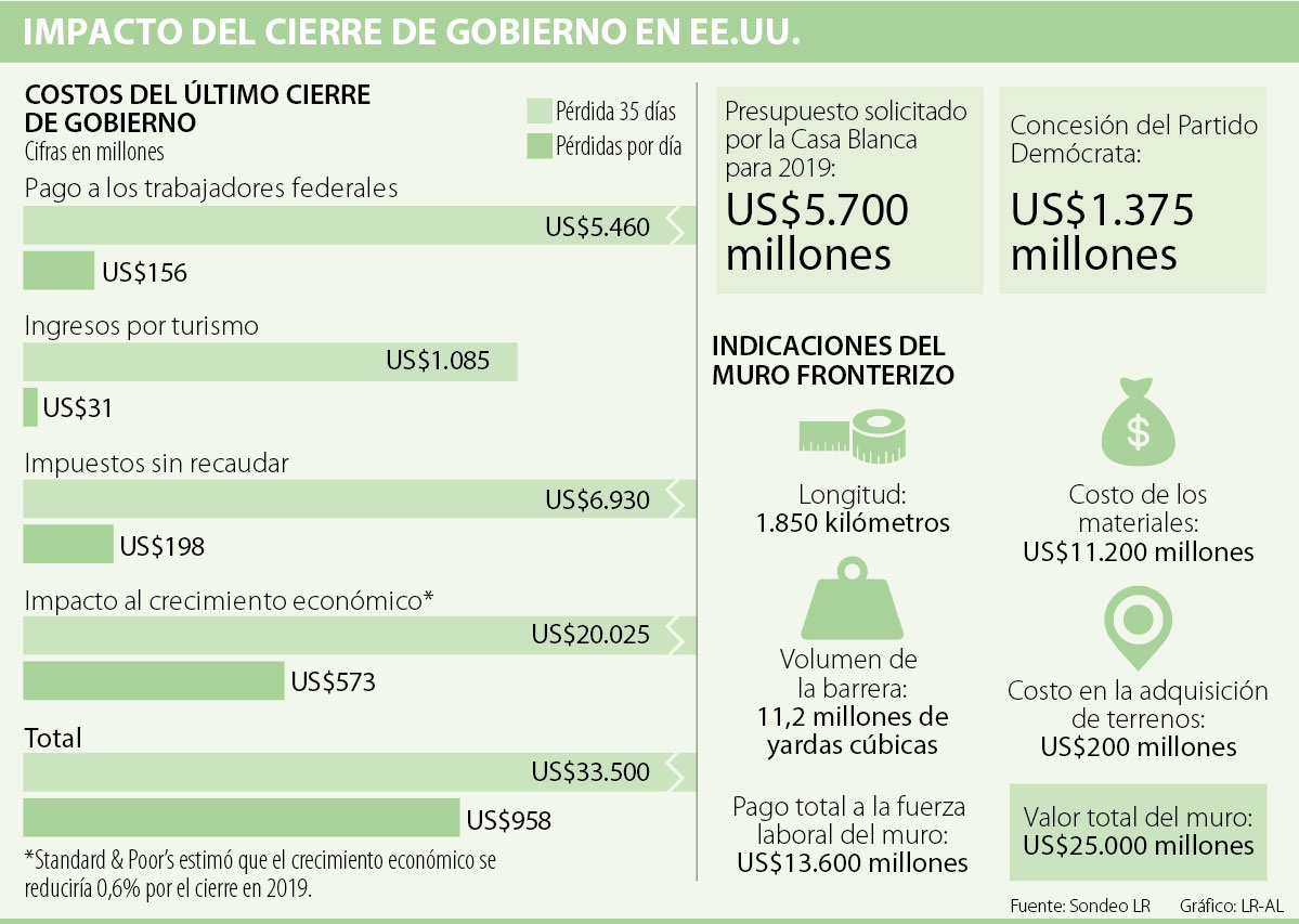 En la búsqueda de construir un muro fronterizo con México, el presidente de Estados Unidos, Donald Trump, libró una batalla sin cuartel contra el Congreso, lo que en consecuencia hizo que el país atravesara el cierre de gobierno más largo en su historia reciente, que según los expertos, habría dejado US$33.500 millones en pérdidas, lo que equivale a US$958 millones diarios.