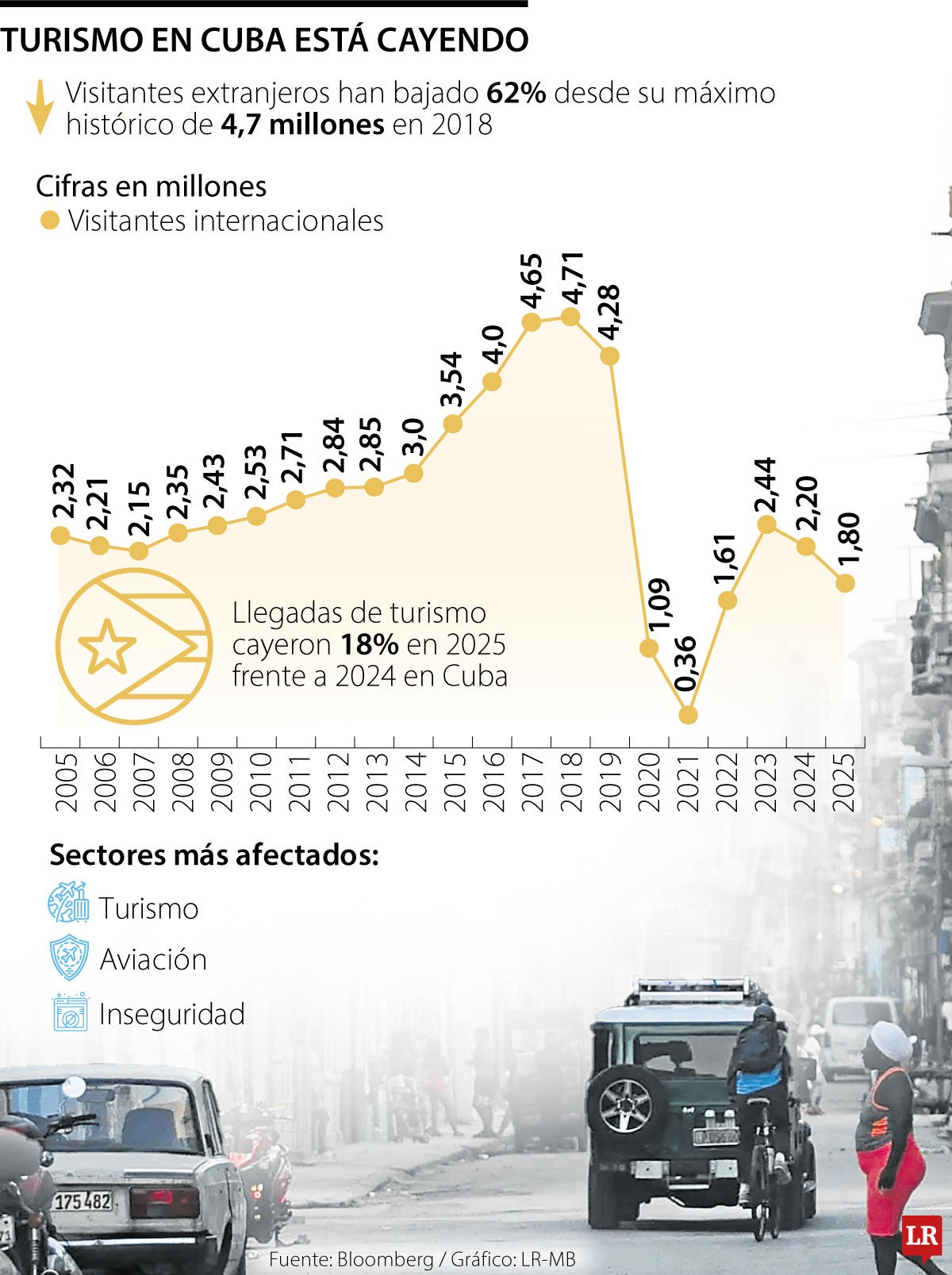 Cuba arrastra diferentes problemas económicos que algunos expertos han catalogado como la peor crisis económica. El turismo, el sector más importante para la economía cubana y el de mayor participación en su PIB, viene decreciendo en los últimos años. Según información de Bloomberg, desde 2023 Cuba pasó de recibir 2,4 millones a menos de 2 millones de visitantes. Además, los visitantes extranjeros han disminuido 62% desde su máximo histórico de 4,7 millones de personas en 2018.
