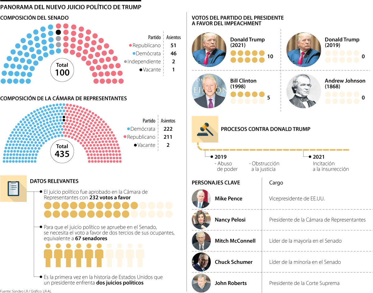 No obstante, la figura de juicio político contra Donald Trump tras su salida de la Casa Blanca pierde fuerza, pues se convertiría en un proceso simbólico cuyo único resultado podría ser la muerte política en caso de obtener los 67 votos necesarios para que este se apruebe en el Senado.
