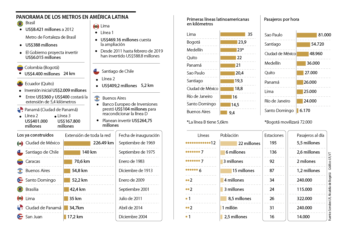 El segundo país de la región que hasta ahora se encuentra entre las mayores inversiones de la región cuando se habla de metro es Colombia. El jueves pasado Bogotá logró la licitación del metro con la formación de un consorcio que construirá los 24 kilómetros de la primera línea llamado Apca Transmimetro, compuesto por las empresas China Harbour Engineering Company Limited y Xi’An Metro Company Limited como contratistas; y Crrc Changchun Do Brasil Railway Equipamentos e Servicos y Bombardier, como subcontratistas, tendrán que construirlo, adecuarlo y operarlo durante los 20 años de operación. La inversión del primer metro que tendrá la capital asciende a los US$4.400 millones.