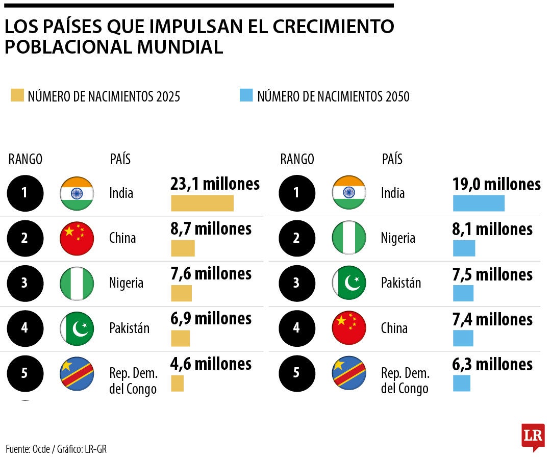 India, China y Nigeria lideran el ranking de más nacimientos en 2025 con 23,1 millones, 8,7 millones y 7,6 millones, respectivamente; en 2050 liderarán India y Nigeria