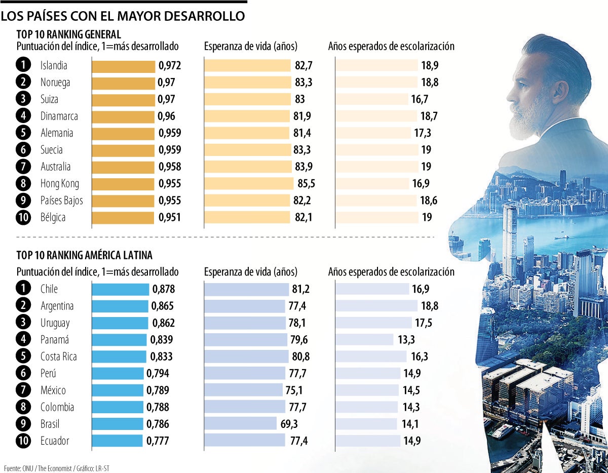 El ranking también tiene en cuenta las economías de la región, aunque están bien alejadas de los primeros lugares del listado. Chile es el primero de América Latina en materia de desarrollo, pero ocupa el puesto 45 a nivel mundial. Tiene un índice de 0,878 puntos sobre 1. Argentina y Uruguay son los que siguen en la región con unas cifras de 0,865 y 0,862 puntos, respectivamente. Panamá, Costa Rica, Perú y México siguen más abajo con un índice de 0,839, 0,833, 0,794 y 0,789 puntos, respectivamente.