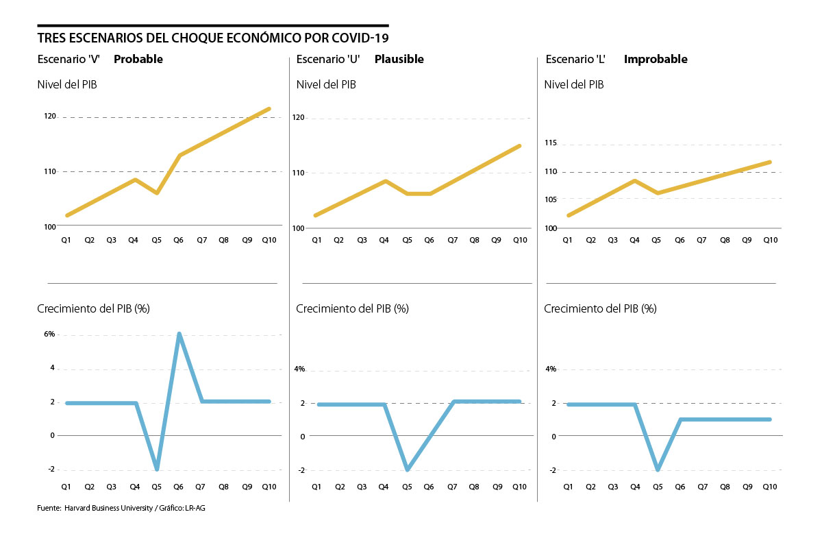 El primer escenario es el de forma de ‘V’ y consiste en fuertes desplazamiento del PIB tanto en el terreno negativo como positivo. En este caso se presentará una recuperación al final. “Este es el clásico, el más factible y el mejor escenario que se podría tener en un contexto como este”, reseñó el estudio.