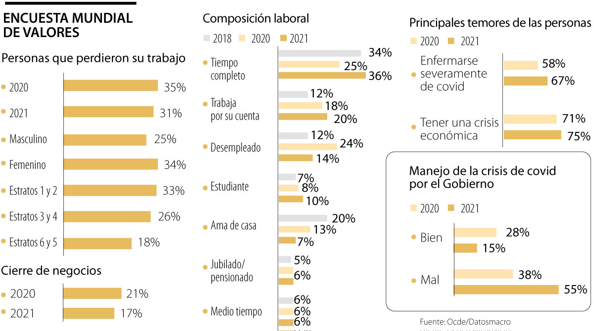 El informe también apunta a que menos gente perdió el trabajo en 2021, comparado con el año pasado durante la pandemia. La leve contracción fue de cuatro puntos porcentuales, pasando de 35% en 2020 a 31% este año.