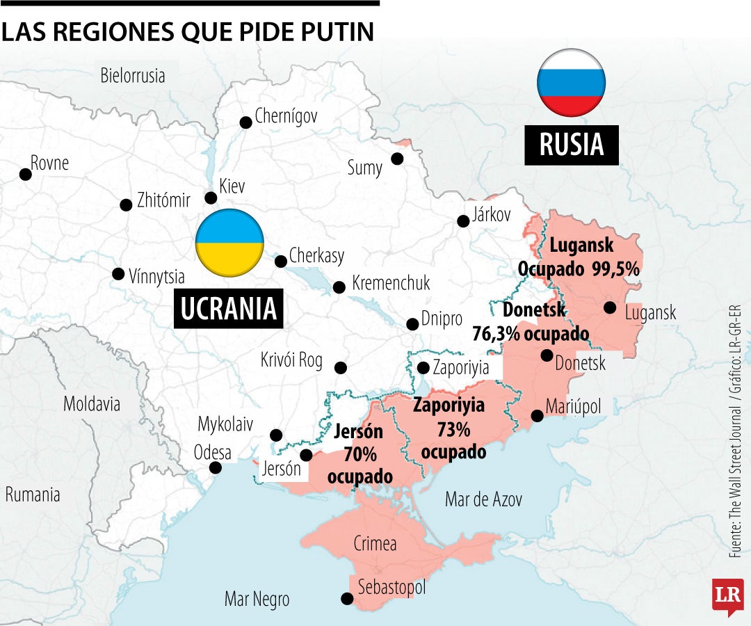 Rusia también detendría el avance de sus reclamos sobre las partes de las regiones ucranianas de Zaporizhia y Kherson que aún no controla, congelando efectivamente las líneas de batalla en sus posiciones actuales.