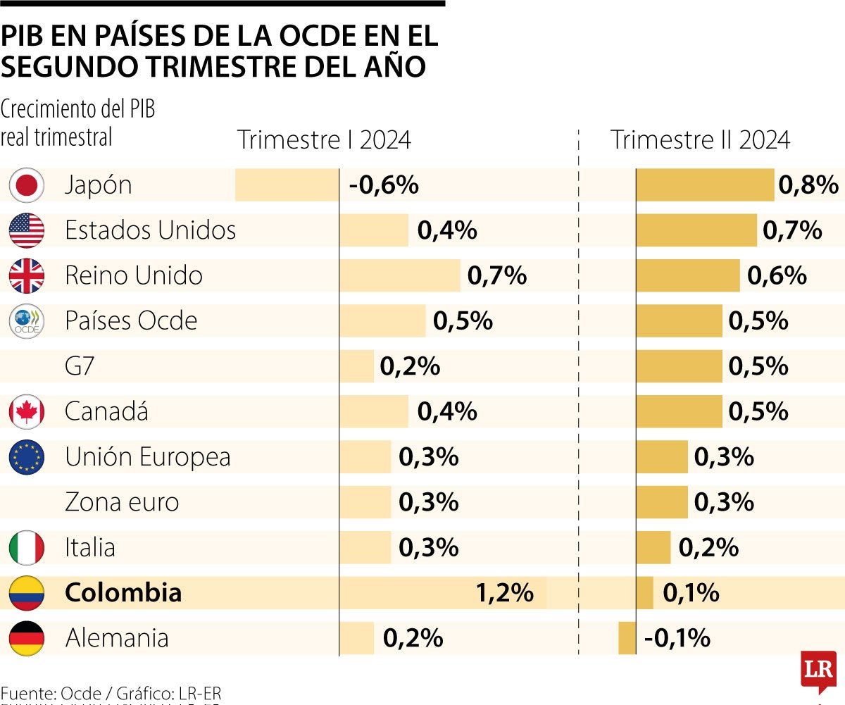 Concluido el segundo trimestre del año, la Organización para la Cooperación y el Desarrollo Económico publicó las cifras de crecimiento económico para este periodo.El conjunto de países Ocde reportó un crecimiento conjunto de 0,5% real trimestral, mientras que Colombia subió 0,1% en el mismo periodo.