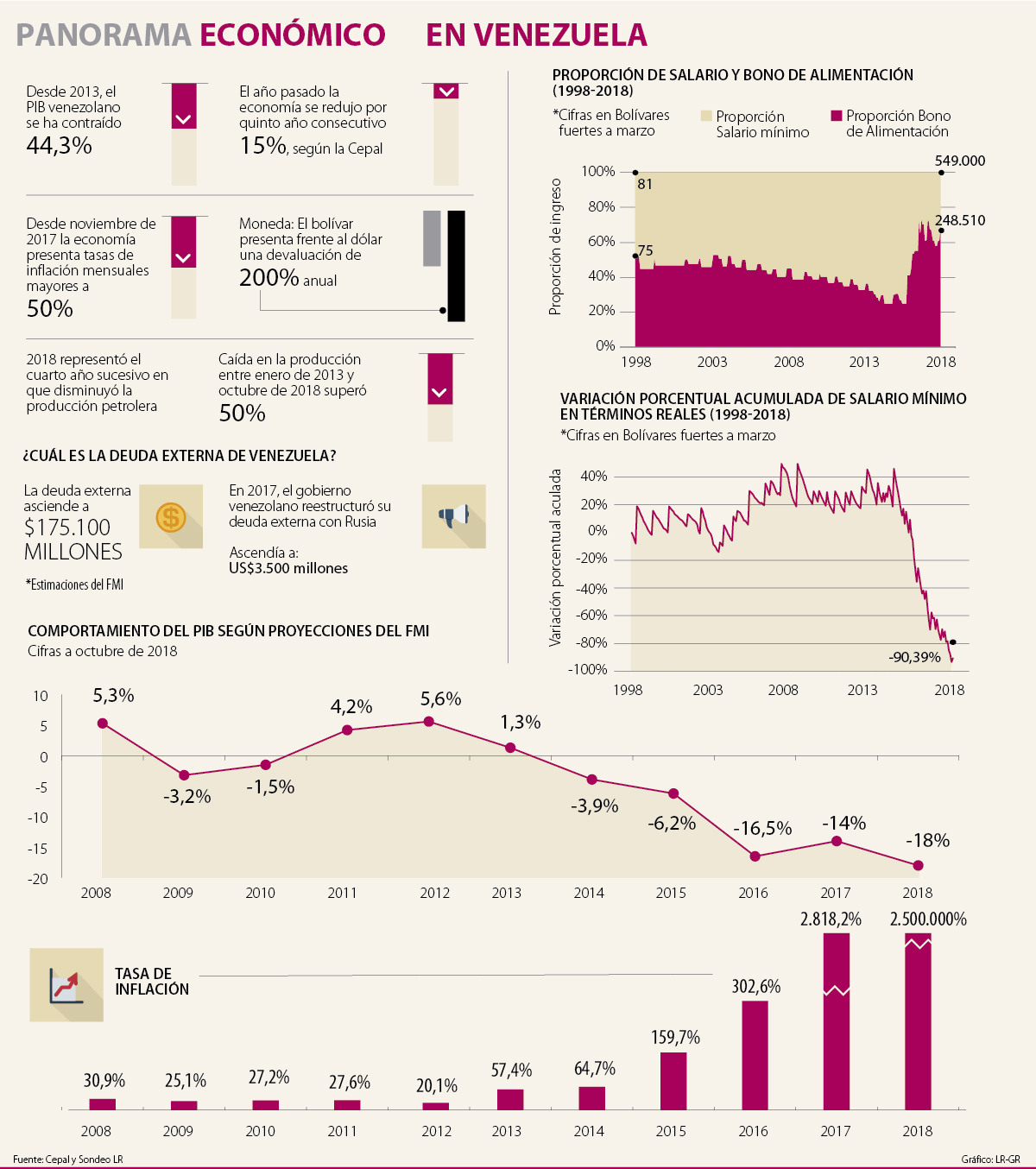 La cifra no es ajena a otros indicadores. En términos de inflación, el país enfrenta un IPC de 2.500.000%, mientras que el FMI calcula que podrá llegar a 10.000.000% este año, jalonado por el vertiginoso aumento de los precios de bienes y servicios durante los últimos años. Una muestra de dicha situación es que, por ejemplo, productos como la harina de maíz o el kilo de café han incrementado sus tarifas en el último mes hasta 300% y 298%, respectivamente.