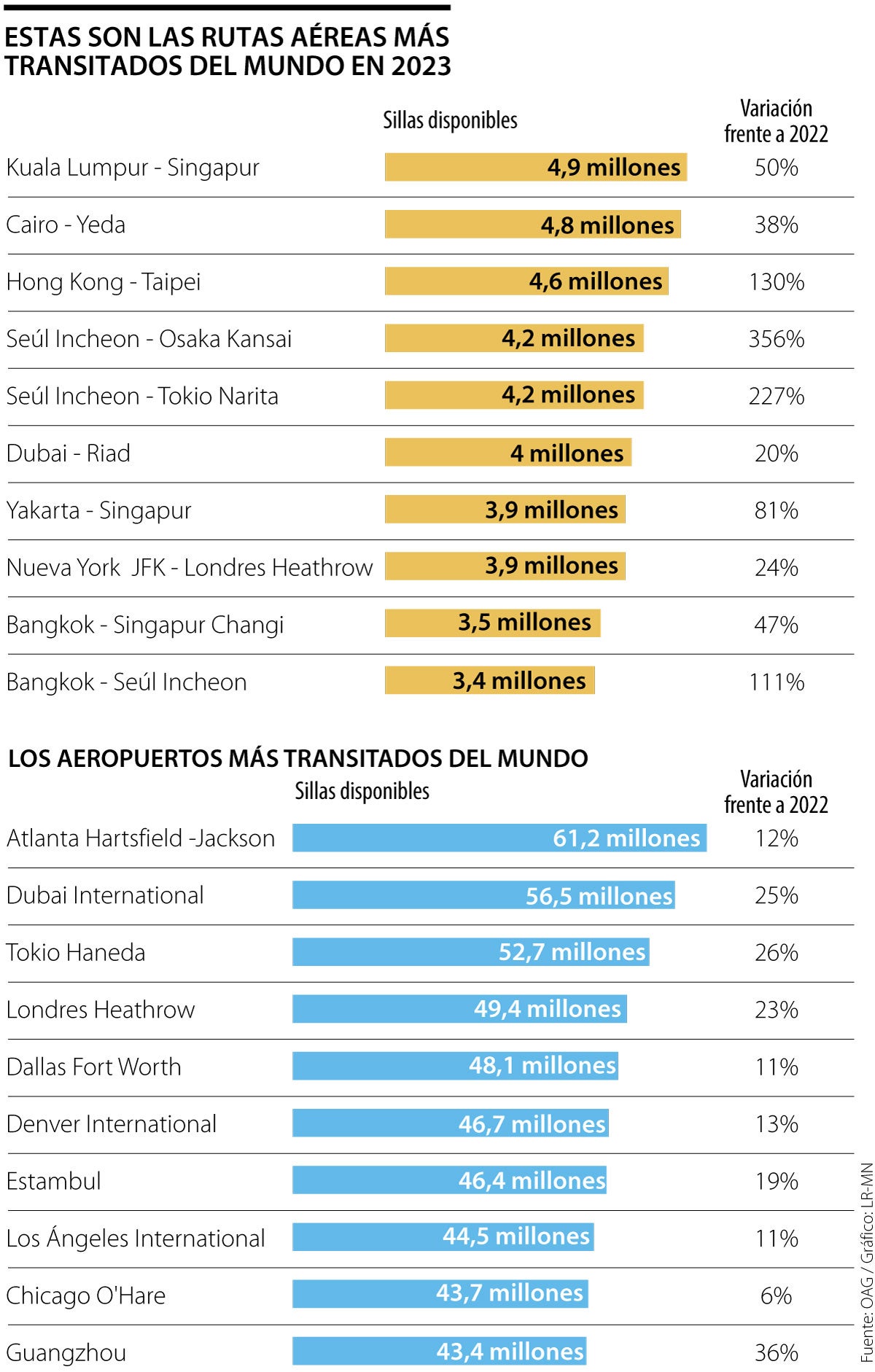 El número de asientos en el tramo aumentó un 50% respecto al año pasado a 4,9 millones, según OAG. La misma ruta fue tercera en 2022 y segunda antes de la pandemia.