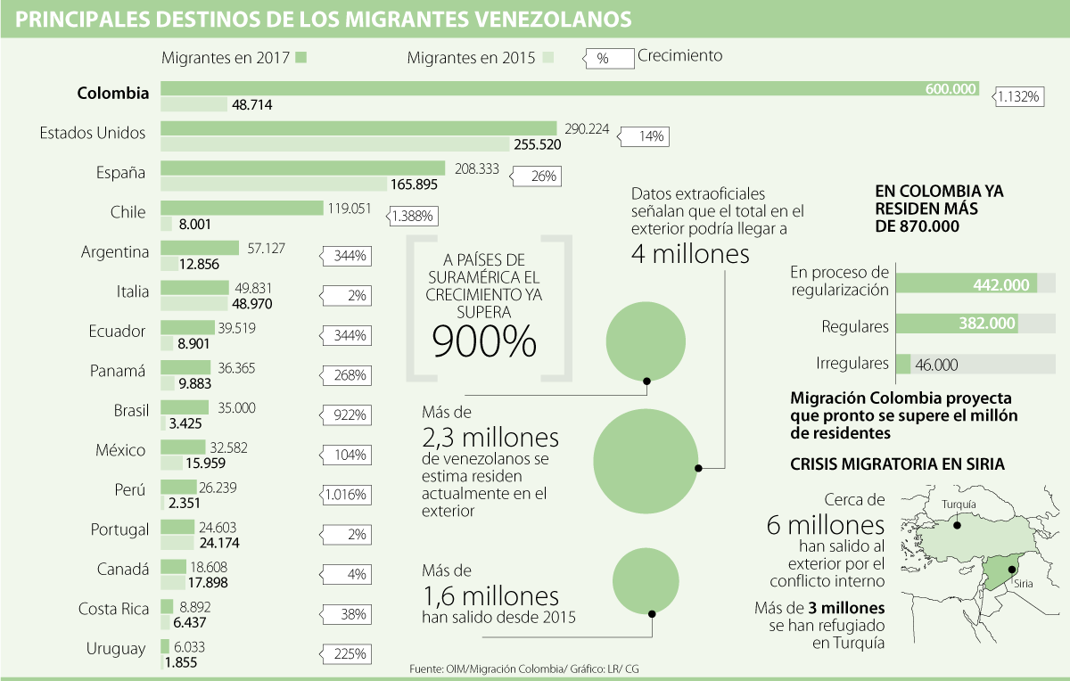 Carlos Holmes Trujillo, ministro de Relaciones Exteriores de Colombia, ha señalado por su parte que la situación venezolana ya se asimila a la que acontece con la crisis migratoria de Siria, de la cual se tienen registros de que supera los seis millones de habitantes refugiados en vecinos como Turquía, Jordania y Líbano. En tanto, el éxodo venezolano alcanzaría la mitad de esta cifra a final de 2018.
