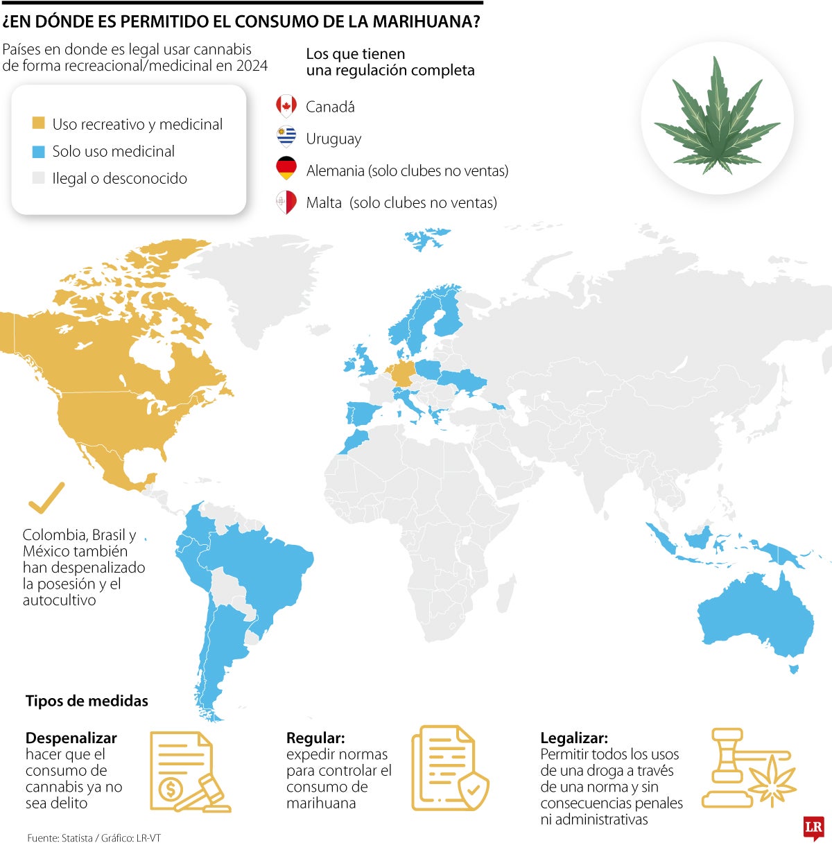 Actualmente, solo Alemania, algunos estados de EE.UU., Malta, Canadá y Uruguay, cómo único país de la región, han logrado tener una regularización completa para el consumo nacional de la marihuana. Pero, ¿qué significa esto? “Regular se refiere a expedir normas para controlar una actividad, como es el caso de Uruguay con los clubes o Canadá con las ventas en dispensarios. Su enfoque es claro: en lugar de perseguir a consumidores y microtraficantes, han optado por proteger la salud pública con productos regulados y controlados”, explicó López.
