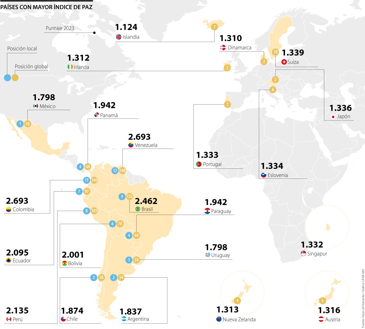 Por ello, el Instituto de Economía y Paz (IEP) mediante su informe anual de Índice de Paz Global (GPI), publicó la lista de los países más seguros del mundo y que tienen mayores posibilidades para así consolidarse. En el ranking de este año en la región destacó a Uruguay y Argentina y en el mundo siguen liderando Islandia, Dinamarca e Irlanda.