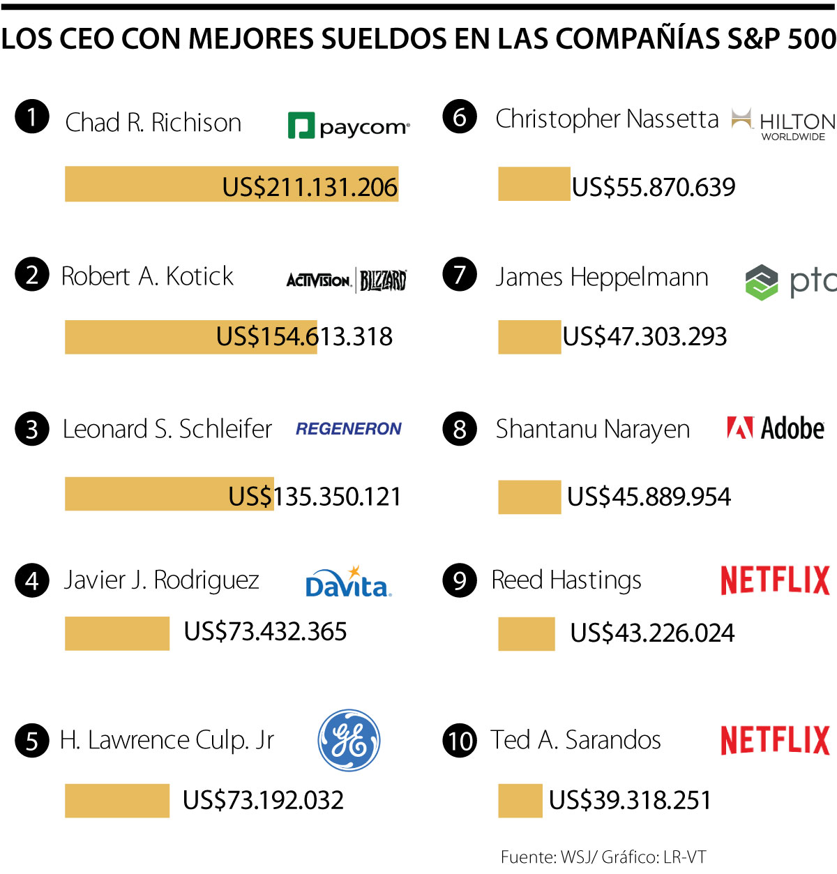 El salario medio de los CEO de las empresas del índice fue de US$13,4 millones y la mayoría obtuvo aumentos cercanos a 5%