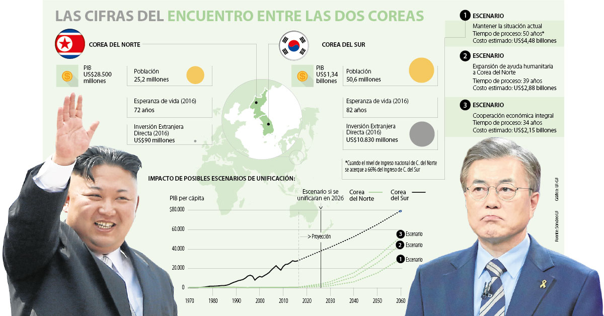 En un escenario en el que se mantenga la situación actual, tomaría cerca de 50 años hasta que el nivel de ingreso nacional de Corea del Norte se acerque a 66% del ingreso de Corea del Sur, con un costo estimado de US$4,48 billones asumido por ambas economías. Mientras que si se presenta un escenario de expansión de la ayuda humanitaria del sur al norte, un proceso de unificación tomaría 39 años hasta hacerse efectivo con un costo de US$2,88 billones.