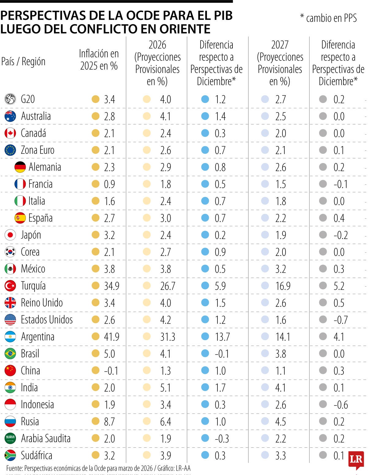 El aumento del precio de la energía ha terminado afectando el costo de vida a nivel global. Para los países del G20, la Ocde prevé que la inflación llegue a 4,0%, lo que representa 1,2 puntos porcentuales más de lo pronosticado anteriormente por la organización. Sin embargo, para 2027, se espera que el indicador se modere hasta 2,7%, suponiendo que las presiones sobre los precios de la energía cedan a medida que el conflicto se distienda.