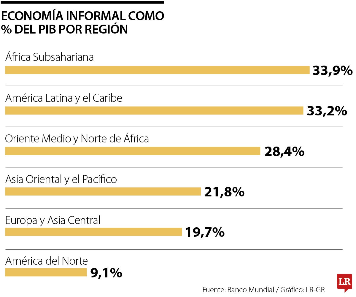 Según datos del Banco Mundial, 33,2% del Producto Interno Bruto, PIB, de América Latina y el Caribe se genera en la economía informal, mientras que la región ocupa el segundo lugar en mayor informalidad económica, solo superada levemente por África Subsahariana con 33,9%. Esto quiere decir que en países como Colombia, Guatemala o Bolivia, una gran parte de la población sobrevive en la informalidad. En contraste, otras regiones como Europa, Asia Central y América del Norte no superan la barrera de 20% para el mismo indicador, con 19,7% y 9,1% respectivamente. Si comparamos las tasas, la informalidad es tres veces mayor en Latinoamérica que en América del Norte.