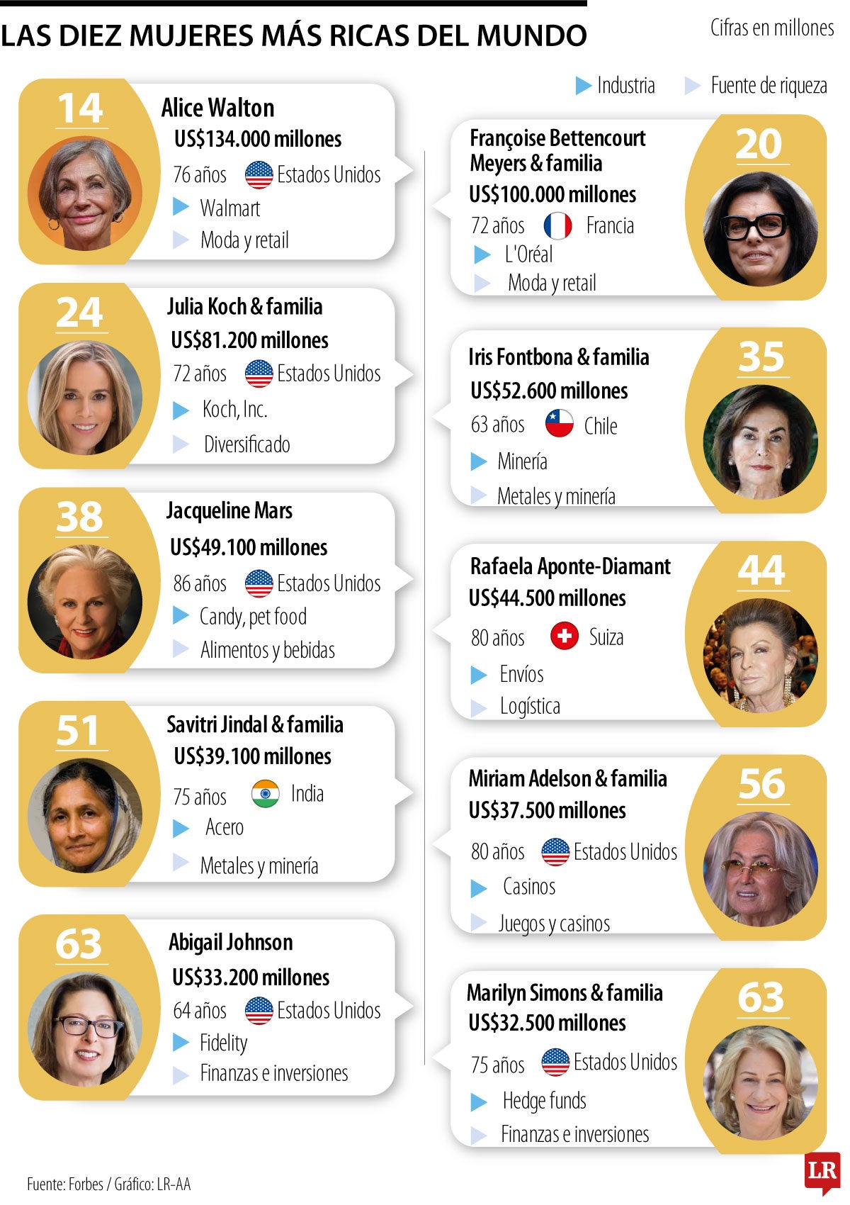 La lista también destaca a las mujeres más ricas del mundo, lideradas por Alice Walton y muestra presencia latinoamericana con Iris Fontbona