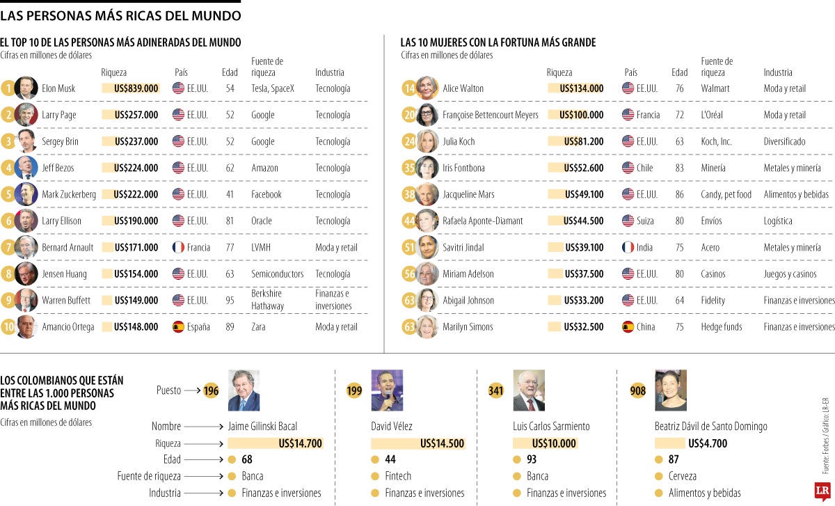 El ranking de colombianos lo completa Beatriz Dávila de Santo Domingo, quien aparece en el puesto 908 con una fortuna estimada en US$4.700 millones.