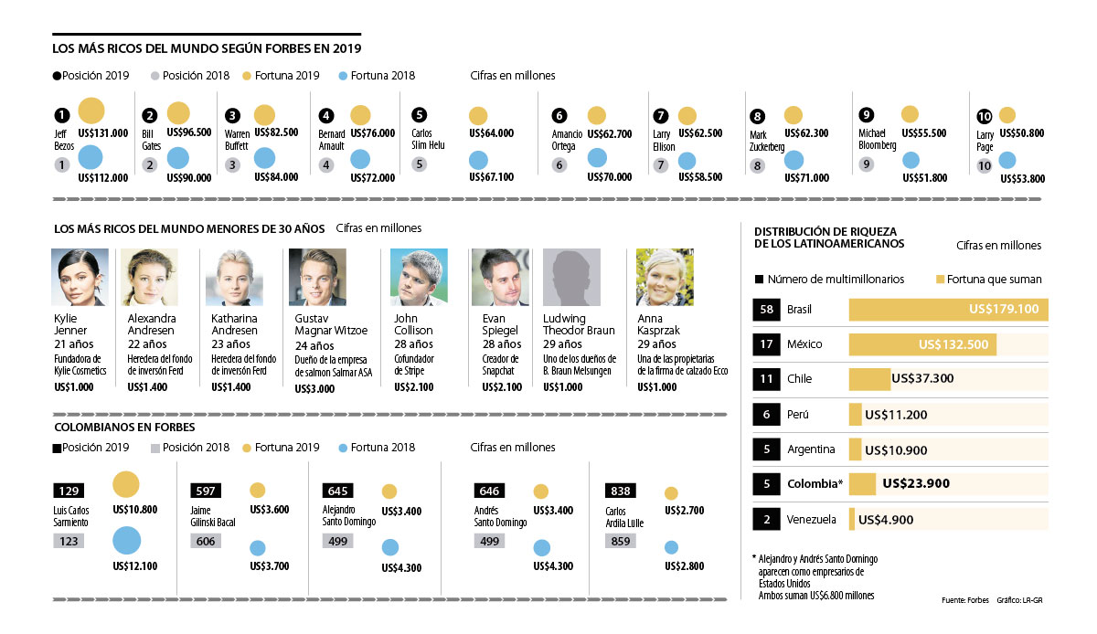 De los multimillonarios locales destaca que dos de los cinco presentes en la lista escalaron posiciones. Se trata de Jaime Gilinski Bacal (US$3.600 millones), al pasar de la casilla 606 a la 597; y de Carlos Ardila Lülle (US$2.700 millones), quien pasó del 859 al 838. El ranking de los colombianos lo lidera Luis Carlos Sarmiento, con una fortuna de US$10.800 millones, suma que lo ubica en la posición 129 del listado general. Los Santo Domingo (Alejandro y Andrés), están después de Gilinski con una fortuna de US$3.400 millones, cada uno, lo que los deja en los lugares 645 y 646.